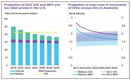 In addition, Figure 10 shows a projection between the U.S. and Australia until 2029. Indeed, this graph illustrates BNEF’s forecast for the total cost of ownership in Australia. It shows that it may be another few years before the popular SUV vehicle class reaches parity, but medium-sized battery electric vehicles could reach TCO parity in 2020. It also shows that Australia in the upcoming years will have dramatically grown in the use and development of EVs, and without a doubt, for this country, in order to achieve its goals of CO2 reduction, reducing the dependency on fossil fuels, especially for the reduction in petrol and petrol cars, is serious. In addition, BNEF predicts that by 2030, the average cost of a midsize battery electric vehicle from more than $50,000 in 2018 to near $37,000 will decline by 2030.