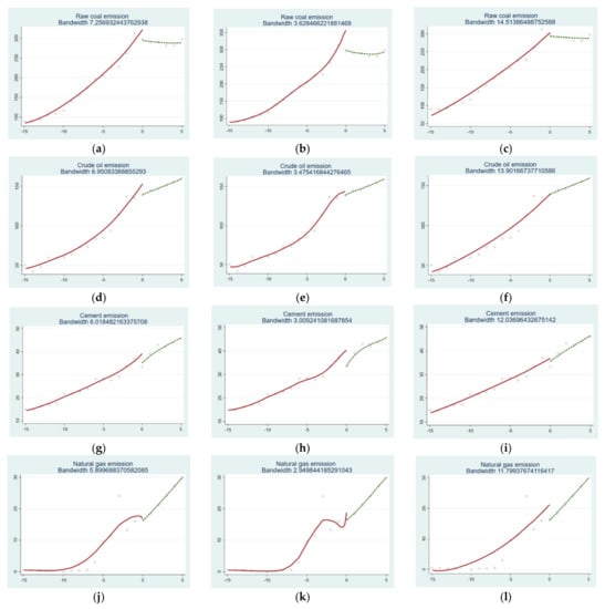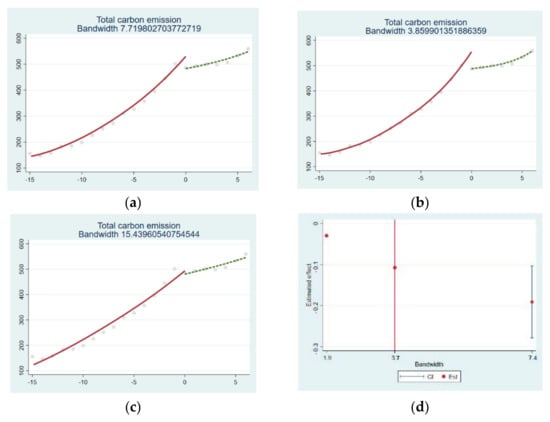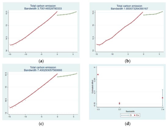Concerning the possibility of over-identifying the estimated results, we added the control variables, LnAGDP, Lnpop, LnSII, Lnfix, and LnTTV, to examine robustness. The RD result obtained after controlling the macroeconomic indicators, which is similar to the previous result (Figure 1), is shown (Figure 2). The Wald test of the regular span of bandwidth (Table 3) was significant at the 1% level, thereby verifying the robustness of our original results. It was revealed that the average treatment effect (ATE) of reducing emission approximated 10.68% in the short-term and 19.06% in the long-term.