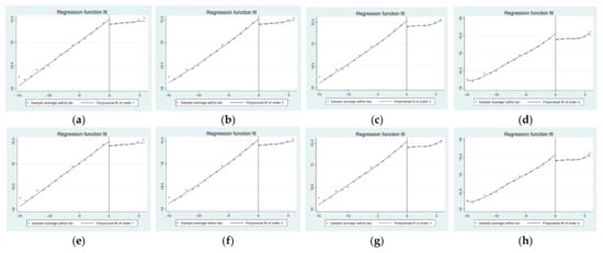 To ensure the robustness of the empirical results, we substituted the rectangular kernel test for the triangular kernel test of the order 1–4 (Figure 3). Similarly, the results were consistent with our expectation that the whole trend as well as the discontinuous point jump direction in the figure would be the same as those of the former, triangle-kernel test results. Thus, the robustness of our conclusions was consolidated via two kinds of kernel tests.