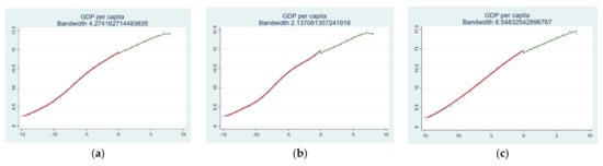 We further conducted a covariate continuity test to exclude the impact of endogeneity. Firstly, we tested one of the main covariates, GDP per capita (LnAGDP). The results illustrated that LnAGDP had no obvious downward dip, and therefore could be considered as continuous (Figure 4a–c). The results showed that under the regular bandwidth span, the Wald test passed significantly at the 1% level (Table 4). Under the 200 span of bandwidth, the Wald test was insignificant at the 11% level (p ~ 0.11). The optimal bandwidths of the regular span, the short 50 span, and the long 200 span were 2.74, 1.37, 5.47 years, respectively. Thus, the evidence did not indicate that the covariate LnAGDP was discontinuous.