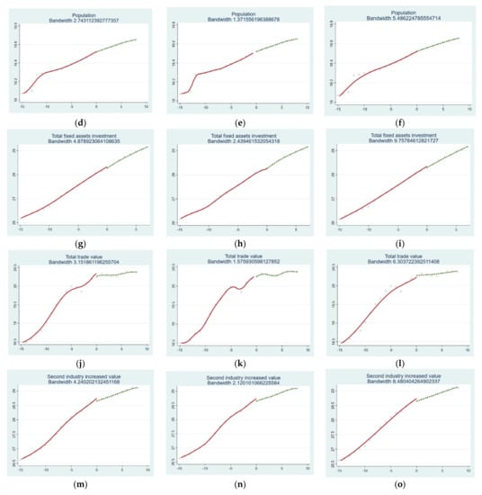 Subsequently, we tested the other covariates (Lnpop, LnSII, Lnfix, LnTTV) to observe their continuities. The test results of the covariate Lnfix are shown (Figure 4g–i). The three bandwidth types all showed an absolutely continuous trend without any noticeable jump, the results of which were consistent with our expectations. The optimal bandwidths of Ln fix were 4.87 (regular span), 2.43 (50 span), 9.76 (200 span), respectively, wherein the level of 50 span was significant at the 1% level (Table 4).