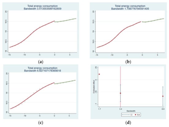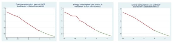 To further analyze how WENGPP affects energy consumption, which restrains TCE, we shifted the explained variable into TEC. We still adopted the RDD method to conduct the empirical test, and also the time node of policy intervention in 2012. Even the control variables remained the same as those in the previous study. As shown in Figure 5, with respect to the three kinds of span bandwidths, the red line indicates that initially the TEC increased rapidly, and then rose steadily until the discontinuous point was reached, upon which the discontinuous point dipped and then ascended slowly.