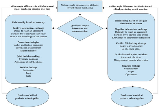 Unethical couples are characterized by a negative exchange of information or an absence of information exchanges between the partners. If one of the partners has knowledge regarding ethical products, this knowledge is either not recognized or not valued by the other who may not be aware or not pay attention to such products. In unethical couples, partners usually try to impose their point of view in an attempt to persuade one another. The outcome of the interaction process can be explained by an unequal distribution of the balance of power in favor of the less ethical partner. According to resource theory, the balance of power is determined by the comparative resources of both partners [51], for instance, in terms of education, income, or competence. The more powerful partner (here, the less ethical partner) uses her/his superior role, and the less powerful partner (here, the more ethical partner) is expected to let it go. The most ethically engaged partner adopts a conflict-minimizing strategy to avoid fights in the store. This strategy is in line with Kirchler’s study [50] and consists of acting to reduce potential conflicts with the partner. When conflict-minimizing is used to persuade, it generally results in autonomic decisions, which refer to decisions individually made by one spouse or the other which are imposed to the partner [76]. In unethical couples, the conflicting situation may persist even after the couple chooses an ethical product in the store. This gives way to negative feelings such as anger or feelings of oppression for the most ethically engaged partner who needs to make concessions, make efforts every day, and let go or give in. The main strategy of influence used by the most ethical partner to increase their couple’s ethical purchase behavior consists in doing the shopping alone. Indeed, when partners do not shop together, they do not need to reach an agreement, and the outcome of the decision depends on who makes the purchase.
