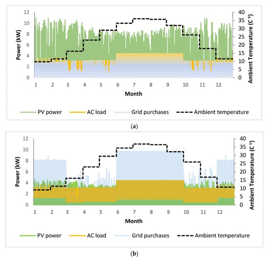 - If the electricity consumption is higher than the PV production, the cost of buying power from the grid to meet the net load is compared with the batteries’ discharge cost. Two possibilities exist: