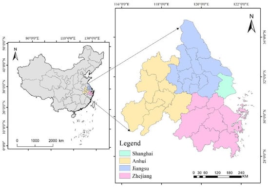 The YRD is one of the regions with the most dynamic economic development, the highest degree of openness, and the strongest innovation capacity in China. It is located on the eastern coast of China and now consists mainly of the four provinces of Shanghai, Jiangsu, Zhejiang, and Anhui. The area of the YRD region is 358,000 square kilometers, accounting for approximately 3.7% of China’s land area. The specific geographical distribution of the YRD in China is shown in Figure 1. As the largest economic circle in mainland China, the economic volume of the YRD accounted for 24.1% of China’s GDP in 2020 [7]. The proportion of added value of the three industries in the YRD has also changed from 5.8:48.5:45.7 in 2010 to 4.1:38.3:57.6 at present. Since the implementation of the YRD Development Policy, the proportion of primary and secondary industries in the YRD has decreased by 1.7% and 10.2%, respectively, while the proportion of the tertiary industry has increased by 11.9%. This shows that the overall strength of the tertiary industry in the YRD has been greatly enhanced. This phenomenon leads to an important question: whether the YRD Development Policy plays an effective role in promoting the upgrading of the industrial structure in the YRD. As such, an in-depth evaluation of the effectiveness of the YRD Development Policy on industrial structure upgrading in this region is of great practical significance.