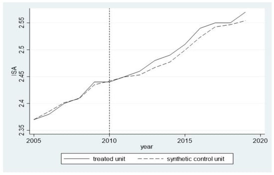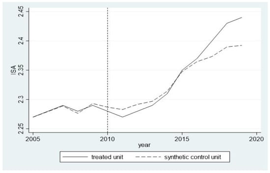 According to the optimal weights of the synthetic control regions above, Table 3 presents the average values between the real and synthetic region predictor variables. It is clearly seen that the level of economic development and the state of urbanization of the synthetic areas are close to the development levels of the areas in reality. There are significant differences among regions in geographic location, resource environment, and economic structure. This leads to a greater distance between the real and synthetic values of the levels of technological innovation, trade openness, and government support than is the case for the other predictor variables. However, the values are still very close to the real situation and are within the acceptable range. This suggested that this work could construct a control group with counterfactual characteristics by better fitting and merging using the SCM. Furthermore, we used the SCM to assess the impact of the implementation of the YRD Development Policy on the upgrading of industrial structure.