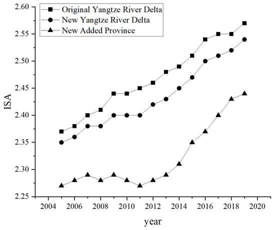 Figure 5 demonstrates the changing trend of industrial structure upgrading in the three experimental groups of the YRD. In Figure 5, the development trend of industrial structure upgrading in the original YRD is more rapid than that in the new YRD, and the level of industrial structure upgrading in Anhui Province is far behind the average level of the original YRD. For example, in 2015, the average industrial structure upgrading level in the original YRD reached 2.51, while in Anhui Province it was 2.35, so that the level of industrial structure upgrading in 2015 in the new YRD reached only 2.47. As is evident, the accession of Anhui Province has not contributed to the development of the industrial structure upgrading in the original YRD. Since the accession of Anhui Province, the level of industrial structure upgrading in the new YRD has dropped to 2.46. It can be said that the newly added Anhui Province did not contribute to the promotion of the industrial structure upgrading of the original YRD but dragged down the industrial structure upgrading of the original YRD.