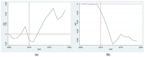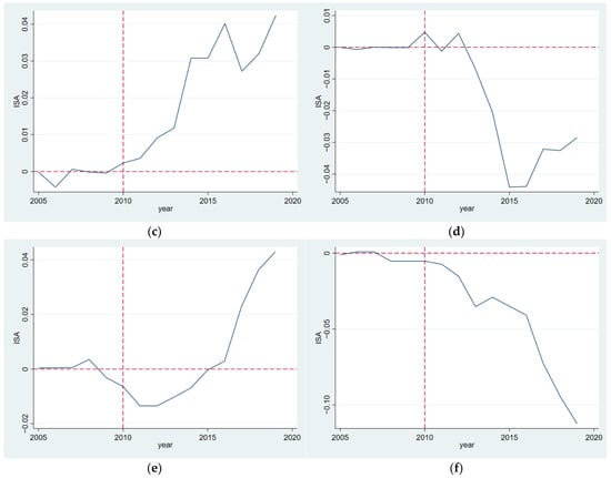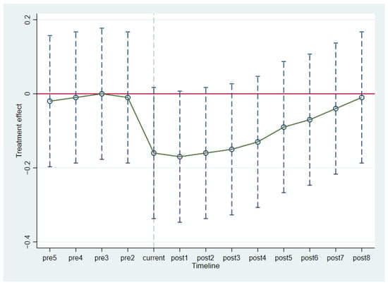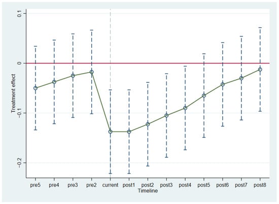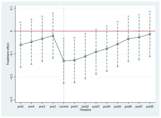 The first step in the robustness test used for this paper was to perform the DID test. A parallel trend test is required before the DID test can be performed. This is to demonstrate that the trends of the experimental and control groups were consistent before the policy was implemented. The results are shown in Figure 6, Figure 7 and Figure 8.