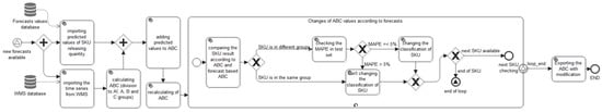 Forecasts connected with stock management are forecasts in the SKU units and they are treated as an input for ABC analysis. A whole stock management system is established in the cloud and the general logic of its conception and way of forecasts usage is shown in Figure 5.
