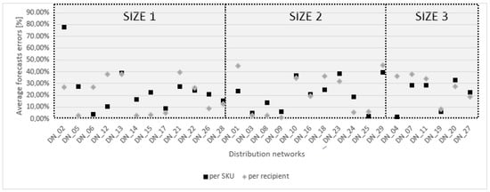 Despite the repeatability of the results, the non-food DNs are the most forecasting-friendly networks from the perspective of forecasts created by 3PL (Table 5) and the worst ones are the specific DNs. The reason for that is the lack of sufficient information exchange between nodes in DNs and the high influence of promotional and different factors, which should be exchanged with 3PL to improve the forecasting system. The size of DNs generally do not influence positively or negatively on the 3PL forecasting system—the one exception is the forecasting system per recipient in the large DN (size 3). The reason for usage is the huge amount of customer data and large, hardly predicted participants in these DNs, meaning the forecast results are worse.