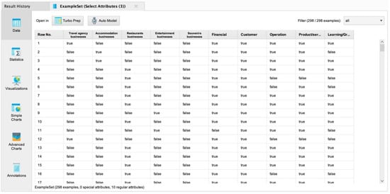 To prepare the data for analysis, the data from the questionnaire was transformed to identify the factors affecting each business. After that, a table of factors that affect each business due to small particulate matter was created. An example is shown in Figure 1. Item Row No. 1 Business type is Travel Agency Business(true), Factors effect are Financial factor(true), Customer factor(true), Operational factor(true), Product/services factor(true), and Learning and development factors(true).