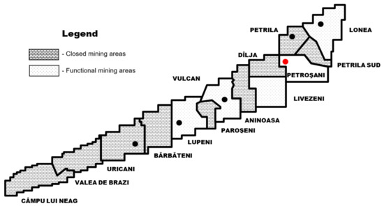 Petroșani is the most important city in the Jiu Valley bituminous coal mining basin (Figure 1). According to the statistics of the last decade, the reserves of bituminous coal in the Lonea, Livezeni, Vulcan, and Lupeni mining perimeters total about 361 million of tons. Of the total reserves, only the recoverable (proven) reserves are available for valorization, and that means about 154 million tons in these four perimeters [13,14].