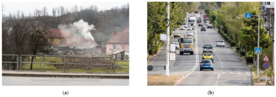Figure 3. The two main sources of air pollution: (a) heating stoves and (b) road traffic.