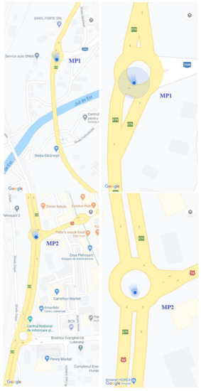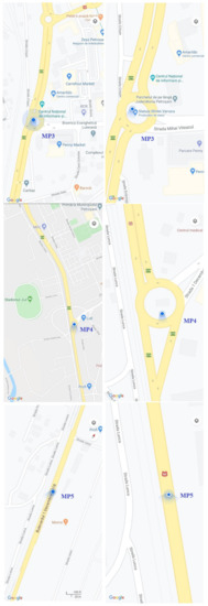 Most of the pollutants emitted into the atmosphere from these two main sources have harmful influences on human health and the environment. In this respect, the monitoring points (MPs) were fixed at the main crossroads of the transit road; this resulted in five roundabouts and an intermediate point where the measurements were performed (Figure 4), as follows: