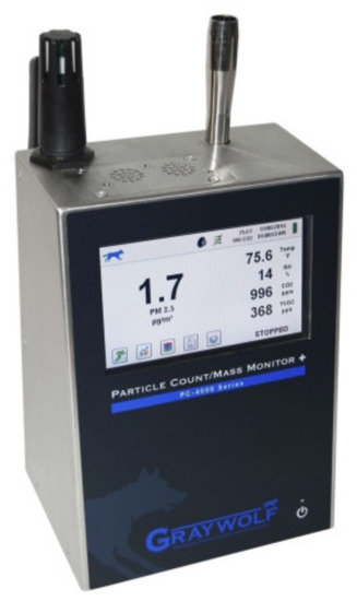 The GrayWolf PC-4000 Particle/Mass Monitor Plus (Figure 5) measures particle sized/particulate matter (PM) from 0.3 μm to 25 μm, with a flow rate of 2.83 LPM (Litres Per Minute), which is the equivalent of 0.1 CFM (Cubic Feet Per Minute). It displays 6 size ranges simultaneously. The sizes 0.3 μm, 0.5 μm, 1.0 μm, 2.5 μm, 5 μm, and 10.0 μm are standard. Particulate matter PM 2.5, PM 10, and TSP (total suspended particulate) may also be concurrently displayed and logged. As a “stand-alone” instrument, it can be used as a portable device, or it can be integrated into a building’s automation system [28].