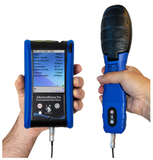 When using Direct Sense II smart probes, the air monitoring probes accommodate from two up to eight smart sensors into a single hand-held device. It is possible to select 25 different aspects of indoor air quality, TVOCs (Total Volatile Organic Compounds), carbon dioxide (Nondispersive Infrared—NDIR—CO2 Sensors), carbon monoxide, ozone, nitrogen dioxide, ammonia, sulfur dioxide, chlorine, hydrogen sulfide, humidity (%RH), temperature (°C), and many others. The Direct Sense II probes (Figure 6) connect to Gray Wolf’s Advanced Sense® meters, which enable additional parameters, such as particulates, differential pressure, air velocity, and formaldehyde [28].