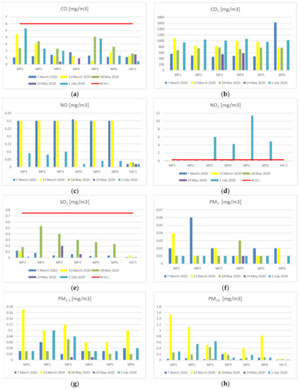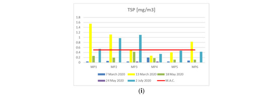 As can be seen in Figure 8, the maximum allowed concentrations—the red line on the charts, was exceeded in the case of NO2 and TSP at certain monitoring points under specific weather circumstances.