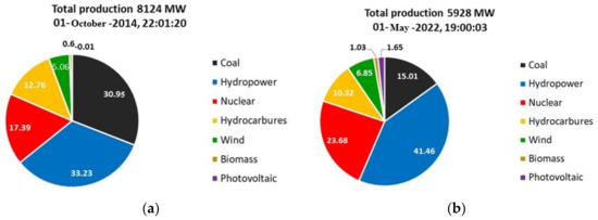 Figure 9. The share of energy sources in Romania on (a) 1 October 2014 and (b) 1 May 2022.