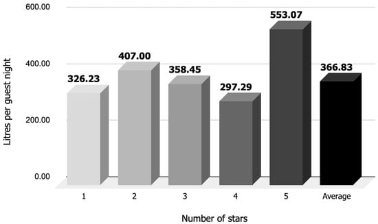 In relation to the first key indicator, water consumption per guest night, Figure 1 shows that water use per guest in hotels of Tenerife and Madeira increased as the hotels’ star ratings increased. The effect of the number of stars of a hotel on water consumption has been analysed by many studies. In a study by Dinarès and Sauri [68], secondary data on annual water consumption showed that higher-category hotels consumed more water annually than lower-category hotels. The average consumption in the sample, 366.83 L per guest night, was far from achieving the internationally recommended level of 140 L [69] and showed a situation where water management could be improved.