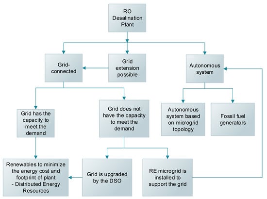 - Autonomous topology (no connection to the grid). The RO system is powered exclusively from the renewable energy system either (a) directly (without battery storage—for very small systems) or (b) through batteries.