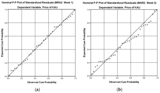 Nominal P-P plot of regression standardized residential of MRA2 (own creation): (a) One-week time lag MRA model with statistically significant variables; (b) two-week time lag MRA model with statistically significant variables; (c) three-week time lag MRA model with statistically significant variables; (d) four-week time lag MRA model with statistically significant variables.