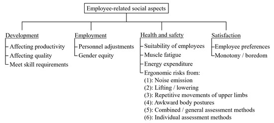 Approaches of ALBP primarily focus on health and safety aspects. Especially the energy expenditure and ergonomic risks are addressed (see Table 5). Furthermore, the suitability of employees and the muscle fatigue as health and safety aspects are integrated. The areas of development and employment are only considered in [81]. For this, a required skill level of hired and inexperienced employees can be achieved through training measures. The personnel adjustments are considered by hiring and firing of employees. The objectives of the multi-objective function are minimizing the number of stations for a given cycle time and minimizing the costs for hiring, firing, training, and salary.