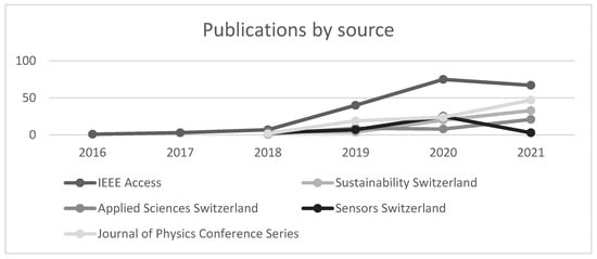 Citations by sources in Figure 2 due to the analysis are divided into four clusters: IEEE Access and Sensors Switzerland belong to a red cluster, Sustainability Switzerland represents a blue cluster, Applied Sciences Switzerland enters a green cluster, and Journal of Physics Conference Series stands for a yellow cluster. The constraints applied in this analysis are 8 as the minimum number of documents of a source and 130 as the minimum number of citations of a source. They are applied to achieve a more accurate visualization of the sources that include the biggest number of publications and are the most cited. IEEE Access embodies the greatest number of documents that correspond to the biggest node with indicators of links (7) and total link strength (217). After it follow Sensors Switzerland (6/73), Applied Sciences Switzerland (6/47), Sustainability Switzerland (5/47), and the Journal of Physics Conference Series (3/6). In terms of the top five publication sources and their links to each other, IEEE Access and Applied Sciences Switzerland have relationships between all mentioned sources, Sustainability Switzerland, and Sensors Switzerland—except Journal of Physics Conference Series, while Journal of Physics Conference Series is only connected to IEEE Access and Applied Sciences Switzerland.