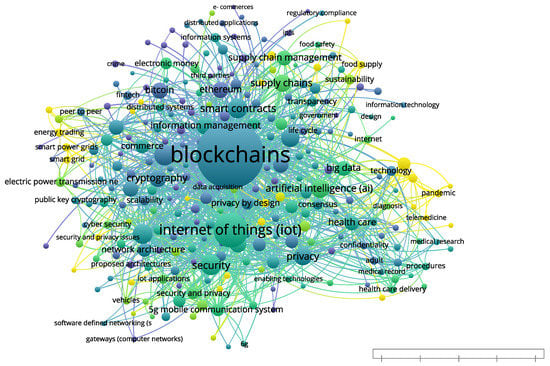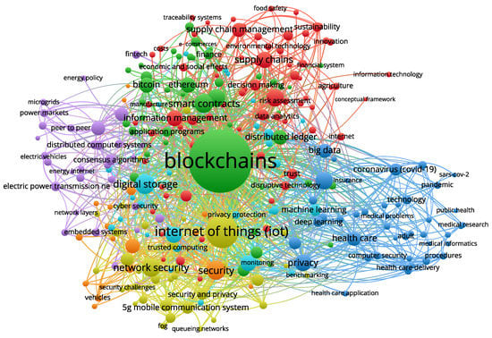 The software analyzes each keyword computing the links, total link strengths, and the co-occurrences of it with other keywords. The occurrences stand for the number of articles in which the keyword is observed. The keywords with the most frequent co-occurrences are presented in Table 5. Blockchains, the Internet of things (IoT), digital storage, security, network security, smart contracts, artificial intelligence (AI), blockchain technology, distributed ledger technology (DLT), and privacy are high up the list of the most highly co-occurring keywords with occurrence weights (total link strength) of 1580 (7189), 409 (2615), 157 (1078), 143 (914), 137 (1021), 136 (713), 123 (770), 122 (491), 121 (585), and 113 (850).