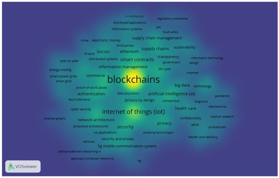 The depth of research related to the topic area can be seen in Figure 5. The more concentrated the colors, the more researchers are conducting research related to the topic area. Blockchains, the Internet of things (IoT), smart contracts, supply chains, digital storage, and such characteristics as privacy, overall security, and network security are widely discussed topics.