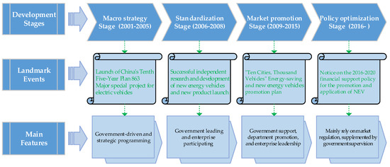Straightening out the development history of China’s NEV industry can reveal the dynamic evolution process of relevant policies. In the observation period, by sorting out 204 policies concerning NEV issued by the Chinese government, we divided the evolutionary process into four stages: the macro-strategy stage, the industry standardization stage, the demonstration and promotion stage, and the industrial adjustment stage. In the following, we elaborate on the development history of China’s new-energy vehicle industry, including landmark events and key features at different stages of development, and represent them in Figure 1.