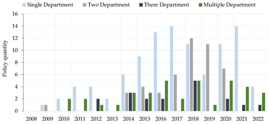 Since the NEV industry began to develop, the number of departments involved in the formulation of policies for the industry has gradually increased, and the cooperative relationship between departments has been strengthened, presenting a situation in which a single department is dominant and a multi-departmental coalition is complementary, as shown in Figure 2. In the process of formulating policies, the Ministry of Industry and Information Technology (MIIT), the National Development and Reform Commission (NDRC), and the Ministry of Finance are the main participating departments, and the major issuing form of these industrial policies is the “announcement” and the “notice”. The overall policy management and control pattern has formed a collaborative model of “planning by the State Council-coordinated operation by the MIIT-review by the NDRC-participation of multiple ministries and commissions”. However, given the game between various departments and their power functions corresponding to coincidence and conflict [42], some problems like low strength and short timeliness have emerged in the policies co-issuance. Therefore, the cooperation between various departments needs to be strengthened, comprehensively.