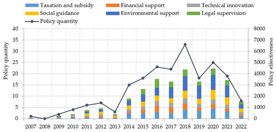 Due to the low volume and poor representativeness of the policies promulgated before 2007, this paper selects the NEV industrial policies promulgated since 2007 as the research object. To better observe the annual number of policies, the total annual effectiveness of policies, and the trend of annual effectiveness of different policy measures, we use the policy effectiveness measurement model for calculation, and the results are shown in Figure 3.