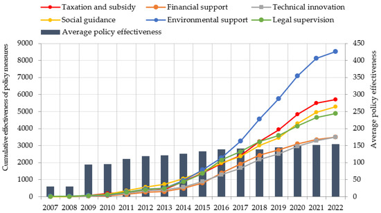 Considering the continuity of the policy, it is more realistic to use the cumulative policy approach to measure the effectiveness of NEV industrial policies. We added up the annual policy measure effectiveness year by year, added up the total effectiveness year by year and used Formula (2) to obtain the average cumulative policy effectiveness, thus obtaining the evolution of the cumulative policy measure effectiveness and the cumulative average policy effectiveness of China’s NEV industry over time as shown in Figure 4. The results show that there are significant differences in their policy effectiveness scores. The effectiveness values of environmental support measures and taxation and subsidy measures are relatively high, which is related to the government’s higher attention in terms of NEV device standard requirements, project access standards, tax relief, etc. While the effectiveness scores of the financial support measures and technical innovation measures are less effective, which requires further attention from the government.