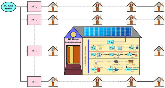 Similarly, in case of DC distribution system, the grid is DC which is connected to solid state transformers (SSTs), and the in-house source bus is DC, as presented in Figure 2. The equations for calculating the system efficiency at given time “t1” are taken from [57], which is the effort of two of current authors.
