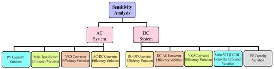 The basic purpose of the sensitivity analysis is to evaluate the effect of variation in the individual load type PEC efficiency, main grid tie PEC efficiency, and PV system capacity on overall the system’s efficiency. Following mathematical model is devised for studying the effect of the efficiency variation of each component in DC system. Similar process shall be adopted with the AC system.