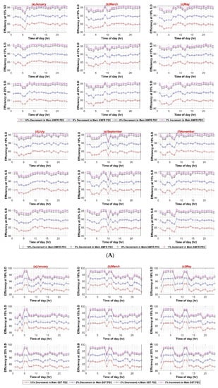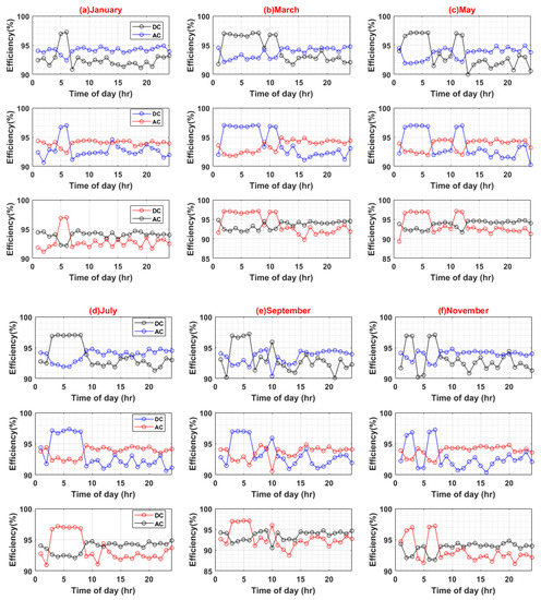 (A) DC–AC Converter Efficiency Variation in DC System (Weekdays); (B) DC–AC Converter Efficiency Variation in DC System (Weekends).