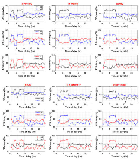 For the comparison of AC and DC systems, this paper focused mainly on efficiency factors for different sets of scenarios such as weekends and weekdays for seasonal and hourly load profiles and variations in PEC efficiencies.
