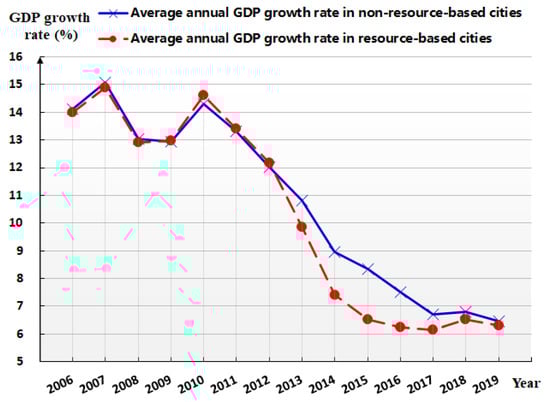 Average annual growth rate of real gross domestic product (GDP) in resource- and non-resource-based cities in China during 2006–2019. Data source: author’s own calculation and the EPS China Data.