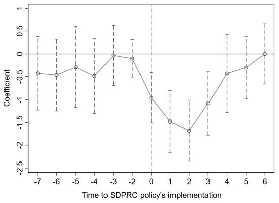 First, we check whether our main result holds if we use alternative indicators of economic growth. Previously, we used the annual GDP growth rate to measure economic growth. Now, we take the annual growth rate of GDP per capita as the dependent variable in Equation (1) and re-estimate the regression coefficients. The estimation result is reported in column (ii) of Table 2. The coefficient of the SDPRC policy is −2.094, which is significant at the 1% level. Our main finding about the adverse effect of the policy still holds. In addition, we tried to use the annual growth rate of night lights to measure economic growth, with the remote-sensing-night-light data from the CNRDS database (https://www.cnrds.com, accessed on 1 March 2022). The estimated coefficient of the SDPRC policy is also significantly negative, although the corresponding regression result is not reported here to save space.