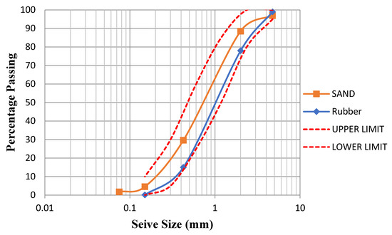 Grading curve of sand and rubber aggregates along with ASTM limits.