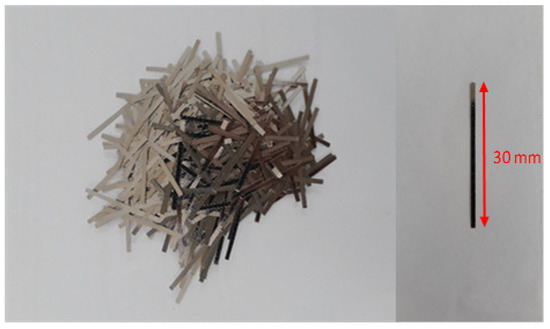 Amorphous metallic fibers were used in the mortar for repair overlays. Research had shown that material having high tensile strength reduced the risk of cracking and delays the crack initiation and propagation [7,22]. Amorphous metallic fibers are very flexible, straight, and easy to handle. In addition to that, these fibers are corrosion-resistant [12]. The image of metallic fibers used is shown in Figure 3. The amorphous metallic fibers used are FF30L6 FibraFlex provided by Saint Gobain Seva. The characteristics of Amorphous metallic fibers and other types of fibers used by previous researchers are presented in Table 1. Rubber aggregates were made by grinding end-of-life tires. The sand was partially replaced by rubber aggregates by equivalent volume in different percentages. Literature on rubber aggregates has also shown that the use of rubber aggregates improved strain capacity before macro-cracking [5]. The specific gravity of rubber aggregates used is 1.2 whereas the specific gravity of sand is 2.73. The rubber aggregates used in this study are shown in Figure 1. The maximum size of rubber aggregates used does not exceed 4 mm which is comparable to the size of sand particles. The particle size distribution curve of rubber aggregates was obtained by sieve analysis performed in accordance with ASTM C33 and presented in Figure 2. To enhance the durability of thin bonded overlays, the work approach adopted in this research is presented in a flow chart shown in Figure 4.