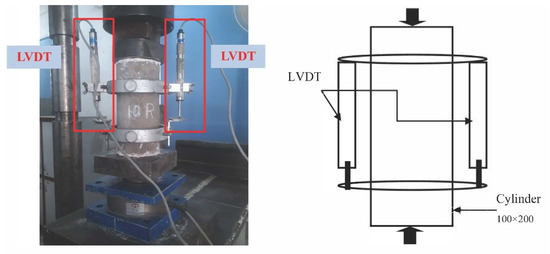Compressive strength tests were conducted after 28 days on cylindrical. specimens having dimensions of 100 mm diameter. and 200 mm height. The compression tests were performed.in accordance with ASTM C39. For each mix, three samples were tested. The test setup for the compression test is shown in Figure 5. Modulus of Elasticity (MOE) tests. were. conducted after 28 days on cylindrical. specimens having dimensions of 100 mm diameter. and 200 mm height. The tests were conducted. according. to ASTM C469. The test setup for the MOE test is shown in Figure 5. Two LVDTs were attached to the specimen to measure deformations which were used to calculate strain.
