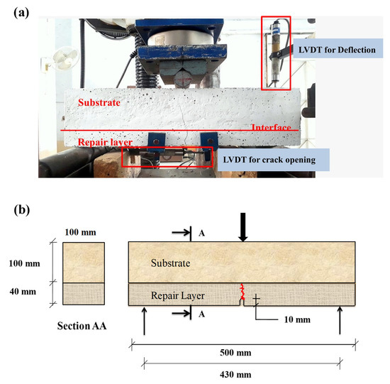 Three-point static bending test was carried out on Shimadzu Universal Testing Machine having a loading capacity of 1000 KN to study the behavior of the overlay–substrate under flexure. A schematic diagram of the repaired composite prism under three-point static bending test and the complete actual testing setup are shown in Figure 6. This test was conducted according to the RILEM TC 162-TDF [47]. These tests were conducted at a loading rate of 0.5 mm/min. Two LVDTs were attached with the composite prism to measure the mid-span deflection and the crack mouth opening (CMOD). CMOD was measured by the LVDT attached at the notch location in the mid span and the vertical deflection of the composite specimens was monitor by other LVDT sensor at the support location.