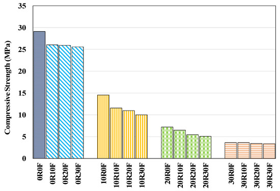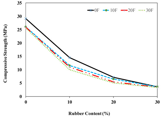 Compressive strength results of all mortar mixtures are presented in Figure 7. The average of three specimens is shown in Figure 7. Results showed that with the addition of rubber aggregates in the mixtures, the compressive strength of the specimen was decreased. It can be observed that 30% partial replacement of natural aggregate with rubberized aggregate showed around an 80% decrease in compressive strength. It may be attributed to the fact that rubber aggregates are weak as compared to the natural aggregates leading to a decrease in compressive strength [8]. Also, the low stiffness of rubber aggregates, as well as poor bonding between cement matrix and rubber particles, result in a loss in compressive strength.