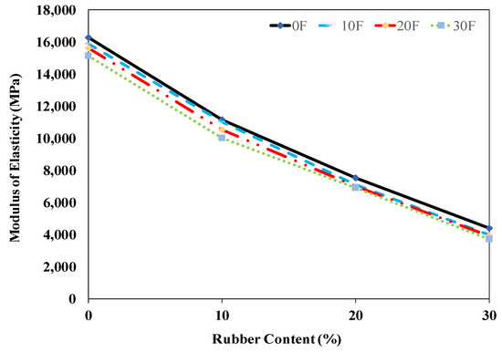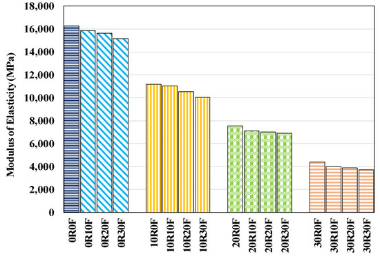 Modulus of elasticity results of different mortar mixtures are shown in Figure 9. For each mix, three samples were tested. The test results of MOE in compression for all mortar mixtures with different replacements of rubber aggregates are presented in Figure 10. Results revealed that with the addition of steel fibers in the mortar mixture, there was a negligible reduction in modulus of elasticity. Further, the modulus of elasticity decreased with the increased content of rubber aggregates. It can be observed that with a 30% partial replacement of natural aggregate with rubber aggregate, the modulus of elasticity is reduced by around 60%. This reduction in MOE may be attributed to the lesser stiffness of rubber aggregates. Similar findings are reported by previous researchers [30]. This reduction may be attributed to poor bonding between cement paste and rubber aggregate and low modulus of elasticity of rubber aggregate according to the rule of mixture law [8].