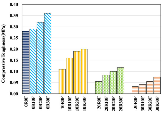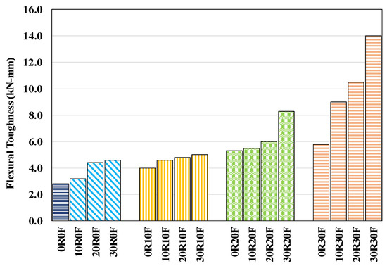 Flexural toughness is enhanced considerably in the presence of rubber content. Deformability of mortar is improved by incorporating rubber as it reduced the local stresses which occur around micro-cracks. It was noticed that the rubberized fiber-reinforced composites especially 30R30F exhibited more toughness as compared to the other mixtures, demonstrating the synergetic effect produced by the combined use of fibers and rubber aggregates in repair material. This enhancement in flexural toughness can also be validated from the previous research carried out on the flexural toughness of concrete incorporating both crumb rubber and steel fibers [35].