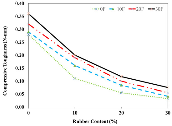 Compression toughness was calculated by obtaining the area under. the stress-strain. curve up to 60% of peak load. Compression toughness results of all mortar mixes are presented in Figure 11. Test results of compressive toughness for all mortar mixtures with different fiber contents are presented in Figure 12. Compression toughness of mortar mixes with a combination of steel fibers and rubber aggregates showed significant reduction with an increment of rubber content and there was a minor increment with the addition of steel fibers. The reduction in compression toughness due to the addition of rubber aggregates was mainly due to low. stiffness. of rubber and the bond. defects. at rubber-cement. paste. interface. These experimental results are in good agreement with the study carried out on compressive toughness of rubberized steel fiber reinforced concrete [20].