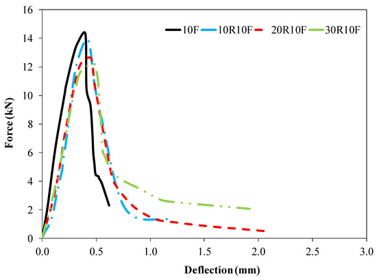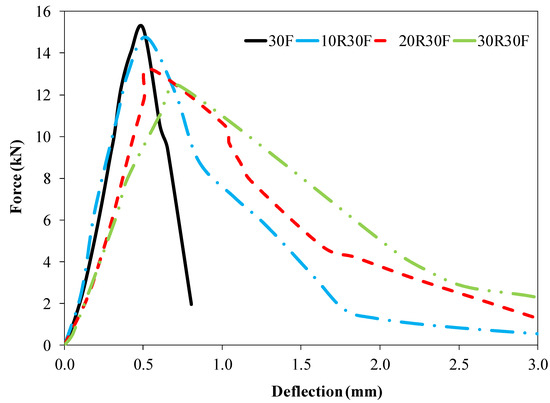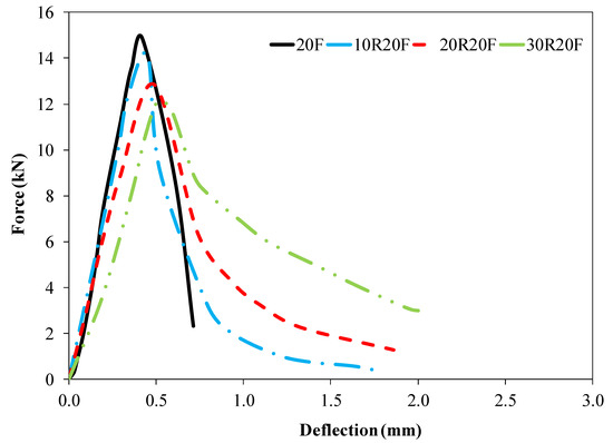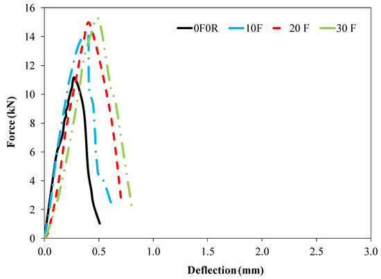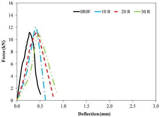 The relationship between force and deflection of composite prisms having different types of repair materials are presented in Figure 13, Figure 14, Figure 15, Figure 16 and Figure 17. The curve of each repair mix composition represents the average of three prism specimens.