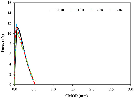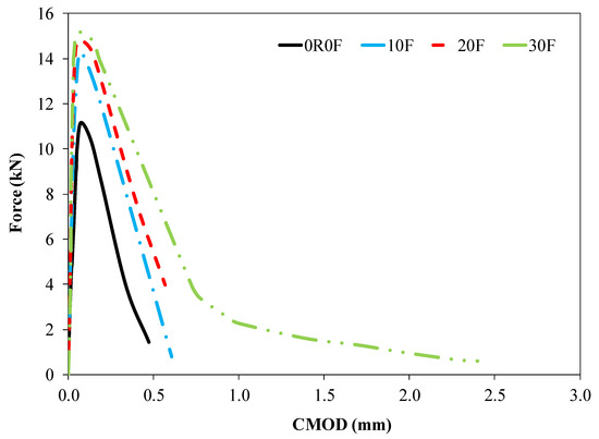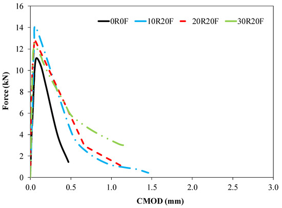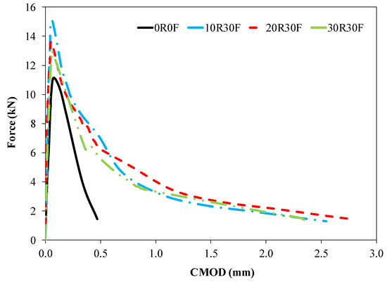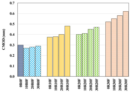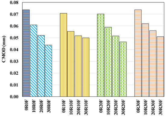 It was observed from the load versus CMOD curves that at any notch opening value, the corresponding value of force was higher as compared to the control mortar, especially, for the composite beams with the repair mixtures incorporating higher steel fiber content. For example, at a notch opening of 0.3 mm the corresponding force is 6 kN, 9.8 kN, 10.2 kN and 12 kN for 0R0F, 0R10F, 0R20F and 0R30F, respectively, as shown in Figure 21. These results also revealed that the steel fibers reinforcement played an important role in controlling notch opening and retraining the cracks under flexure loading. In the post-peak region, steel fibers control the cracks from further propagating by bridging action and provide higher post-peak residual strength. The values of CMOD at peak load are presented in Figure 25. The results revealed that rubber incorporation controls the notch opening up to the peak load by delaying micro-crack propagation to become macro cracks. For instance, at peak load the highest notch opening is observed for 0R0F (i.e., about 74 μm) and minimum for 30R0F (i.e., 44 μm).