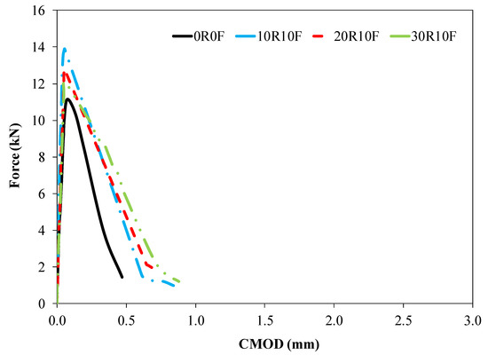 The relationship. between. force. and CMOD of composite. prisms having. different types of repair materials. are presented in Figure 20, Figure 21, Figure 22, Figure 23 and Figure 24. The curve of each repair mix composition represents the average of three prism specimens.